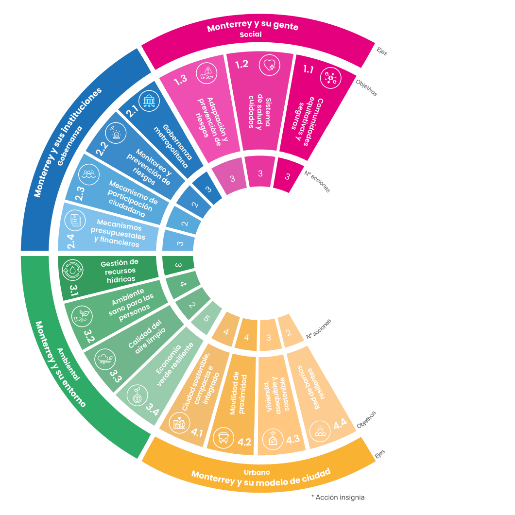 El Plan de Resiliencia de Monterrey es una hoja de ruta estratégica que integra acciones concretas en diferentes ejes: social – Monterrey y su gente, gobernanza – Monterrey y sus instituciones, ambiente – Monterrey y su entorno, urbano – Monterrey y su modelo de ciudad. Lo anterior, con el objetivo de reducir riesgos y aumentar la capacidad de respuesta ante eventos climáticos extremos, emergencias y otros desafíos urbanos. Este plan no solo busca proteger a las comunidades más vulnerables, sino también impulsar una transformación urbana que beneficie a toda la ciudad.